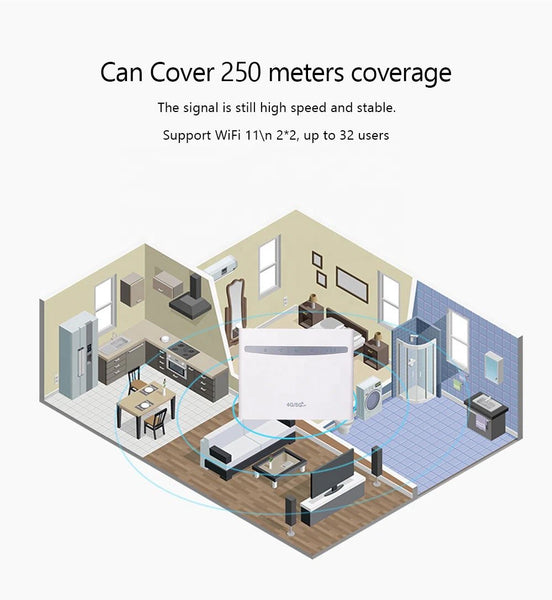 B525 4G WiFi CPE router provides a wireless transmission speed up to 300Mbps. Internal dual-antenna, select able 4G / 3G signal, produce a 2.4GHz WiFi hotspot with a powerful 250 square meter WiFi coverage. Internet connection sharing reaches to 32 WiFi users at the same time. Stylish design to fit in perfectly with your home, With LED indicator display, see the status easily.